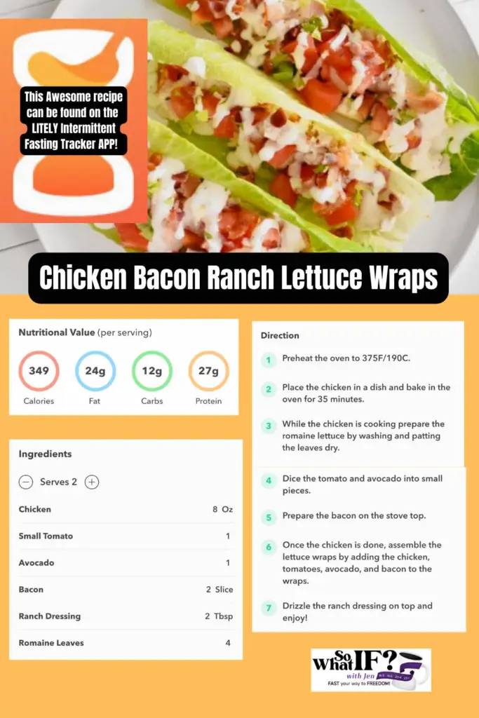 Chicken Bacon Ranch Lettuce Wraps – These things are absolutely DEEEELICIOUS! Love, Love, Love! You have got to try. They are Low-Carb, simple to make and so yummy! This is an awesome recipe I took straight from the LITELY Intermittent Fasting Tracking App that I love so much. Learn more about this incredible weight loss app RIGHT HERE!