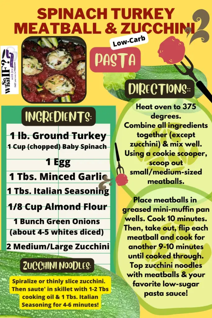 SPINACH TURKEY MEATBALL & ZUCCHINI “PASTA” – This is another one of my go-to favorite dinner recipes (can be found in my weight loss dinner recipe ebook) and is super simple and delicious! ENJOY!