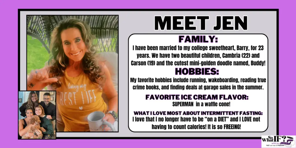 Jen has been living her ABSOLUTE BEST LIFE since she was introduced to the life-changing intermittent fasting lifestyle in January of 2021 and has made it her mission to teach as many people as she can about the awesomeness of living an “IF” lifestyle!